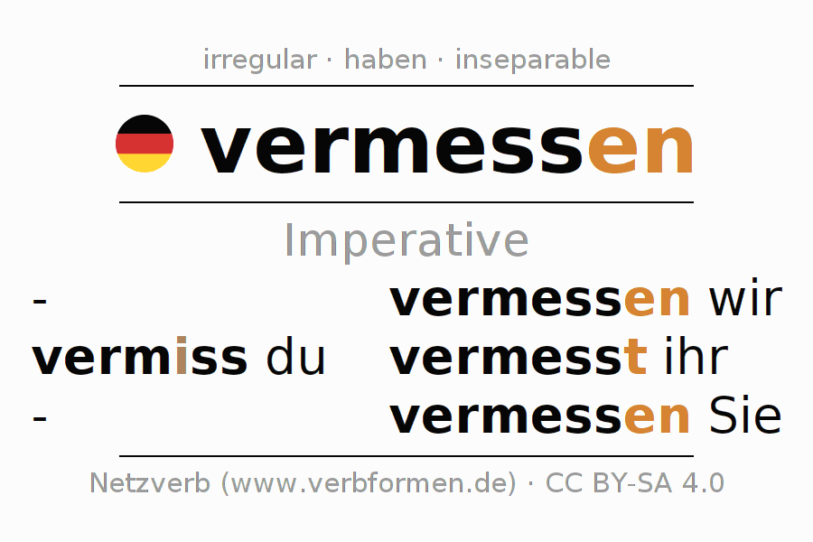 The conjugation of vermessen (measure, survey) in the imperative is: vermiss (du), vermessen wir, vermesst (ihr), vermessen Sie. The imperative is formed with the stem of present tense mess. As an irregular verb there is the changed stem miss in the second person singular. The endings -, -en, -t, -en are appended to the stem. The ending of the 2nd person singular has been shortened by one e, as the stem ends on s. The personal pronoun is usually omitted in the 2nd person singular.The formation of the forms corresponds to the grammatical rules for the conjugation of the verbs in imperative. Comments ☆