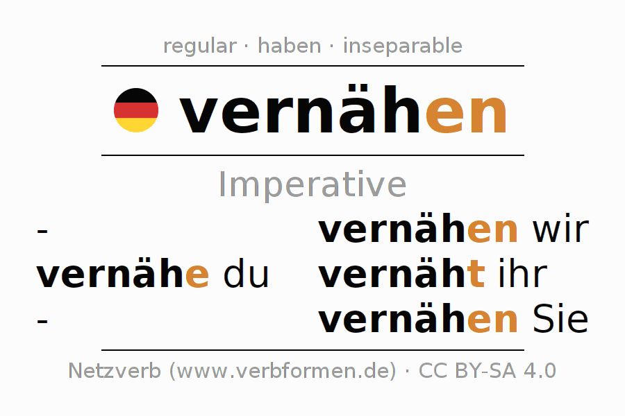 The conjugation of vernähen (stitch, sew together) in the imperative is: vernähe (du), vernähen wir, vernäht (ihr), vernähen Sie. The imperative is formed with the stem of present tense näh. The endings -e, -en, -t, -en are appended to the stem. The personal pronoun is usually omitted in the 2nd person singular.The formation of the forms corresponds to the grammatical rules for the conjugation of the verbs in imperative. Comments ☆