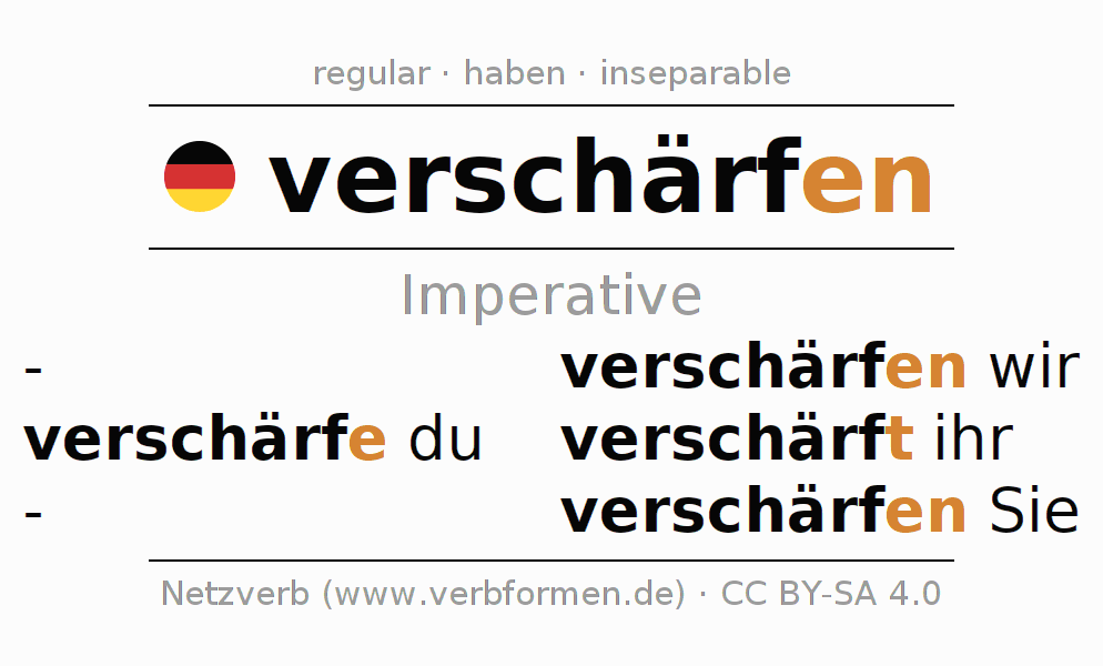 The conjugation of verschärfen (intensify, sharpen) in the imperative is: verschärfe (du), verschärfen wir, verschärft (ihr), verschärfen Sie. The imperative is formed with the stem of present tense schärf. The endings -e, -en, -t, -en are appended to the stem. The personal pronoun is usually omitted in the 2nd person singular.The formation of the forms corresponds to the grammatical rules for the conjugation of the verbs in imperative. Comments ☆
