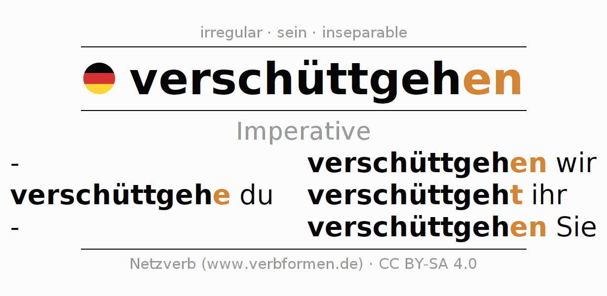 The verb verschüttgehen fully conjugated in all persons and numbers in the Imperative Present