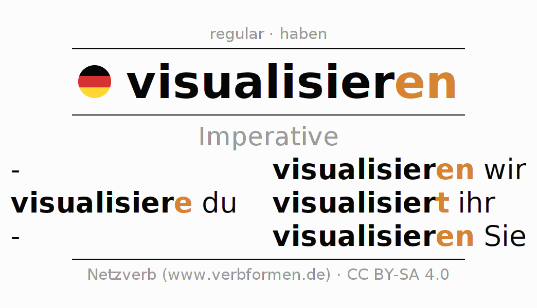 The conjugation of visualisieren (visualize, visualise) in the imperative is: visualisiere (du), visualisieren wir, visualisiert (ihr), visualisieren Sie. The imperative is formed with the stem of present tense visualisier. The endings -e, -en, -t, -en are appended to the stem. The personal pronoun is usually omitted in the 2nd person singular.The formation of the forms corresponds to the grammatical rules for the conjugation of the verbs in imperative. Comments ☆