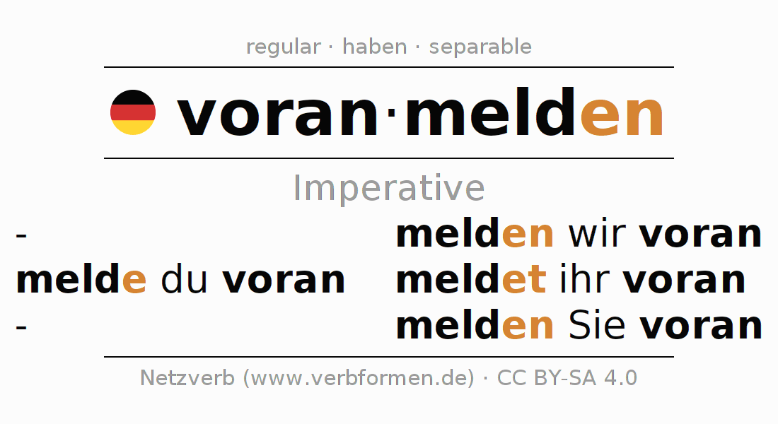 The conjugation of voranmelden (pre-register, announce) in the imperative is: melde (du) voran, melden wir voran, meldet (ihr) voran, melden Sie voran. The imperative is formed with the stem of present tense meld. The endings -e, -en, -et, -en are appended to the stem. The ending of the 2nd Person Singular is extended by an e, as the stem ends in d. The prefix voran- of voranmelden is separated.The personal pronoun is usually omitted in the 2nd person singular.The formation of the forms corresponds to the grammatical rules for the conjugation of the verbs in imperative. Comments ☆
