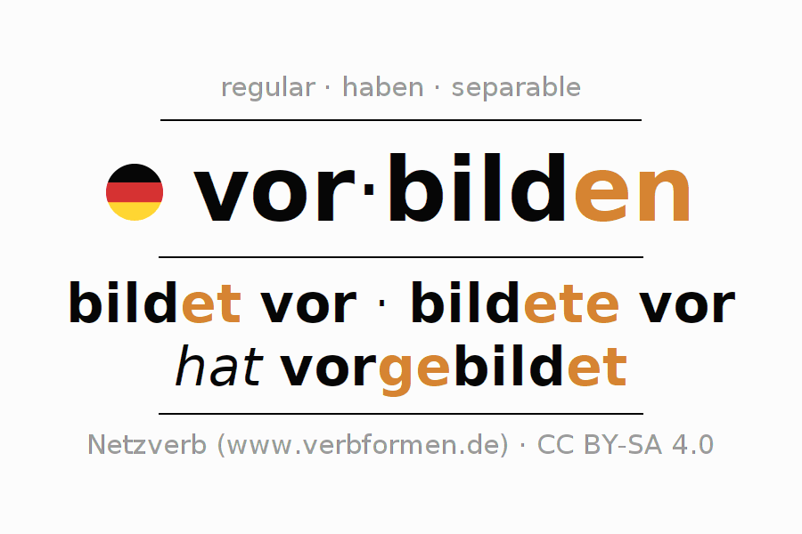 The conjugation of vorbilden (preform, prepare) in the imperative is: bilde (du) vor, bilden wir vor, bildet (ihr) vor, bilden Sie vor. The imperative is formed with the stem of present tense bild. The endings -e, -en, -et, -en are appended to the stem. The ending of the 2nd Person Singular is extended by an e, as the stem ends in d. The prefix vor- of vorbilden is separated.The personal pronoun is usually omitted in the 2nd person singular.The formation of the forms corresponds to the grammatical rules for the conjugation of the verbs in imperative. Comments ☆