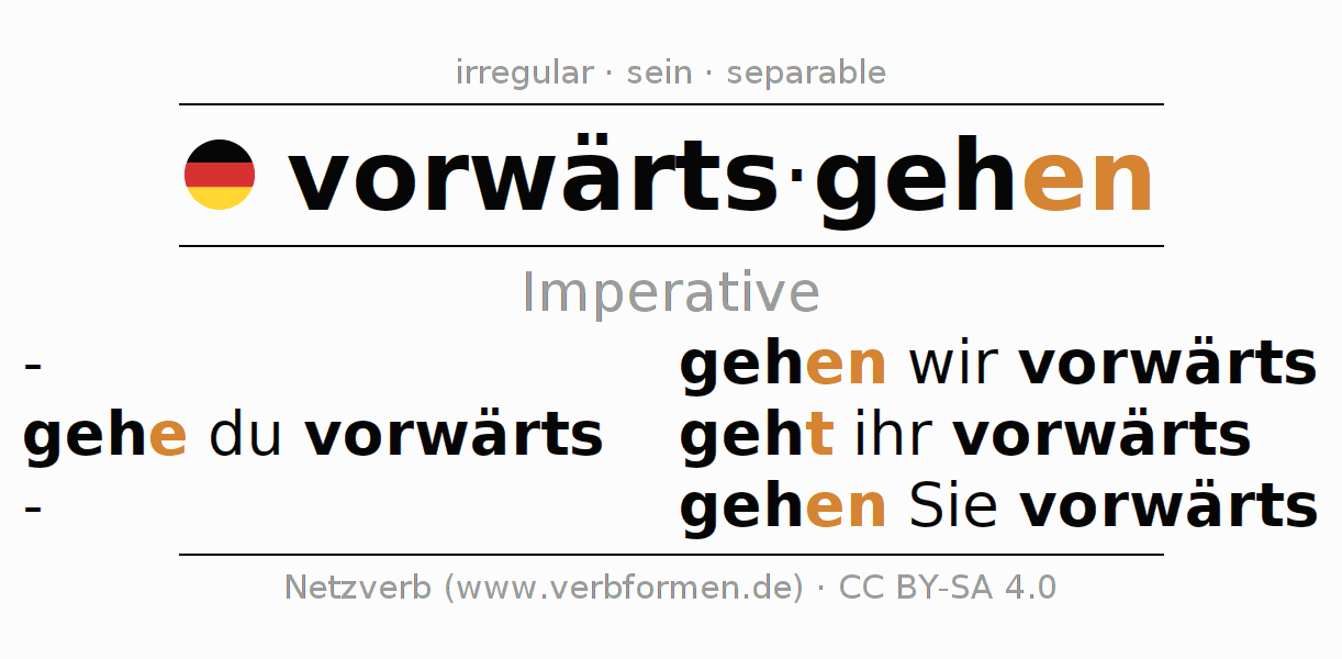 The verb vorwärtsgehen fully conjugated in all persons and numbers in the Imperative Present