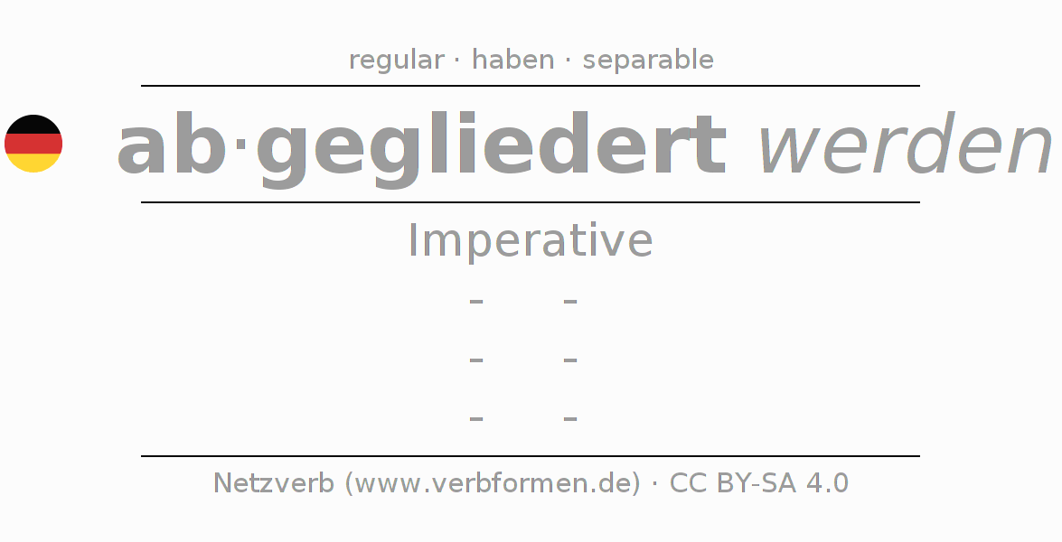 The conjugation of abgliedern in Imperative Present Imperative Passive is -, -, -, -.The conjugation corresponds to certain grammatical rules. Likewise the requirements for the conjugation of the simple verb forms of abgliedern in Imperative. Comments ☆