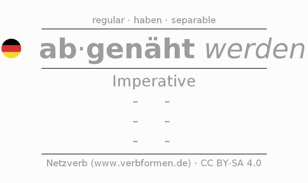 The conjugation of abnähen in Imperative Present Imperative Passive is -, -, -, -.The conjugation corresponds to certain grammatical rules. Likewise the requirements for the conjugation of the simple verb forms of abnähen in Imperative. Comments ☆
