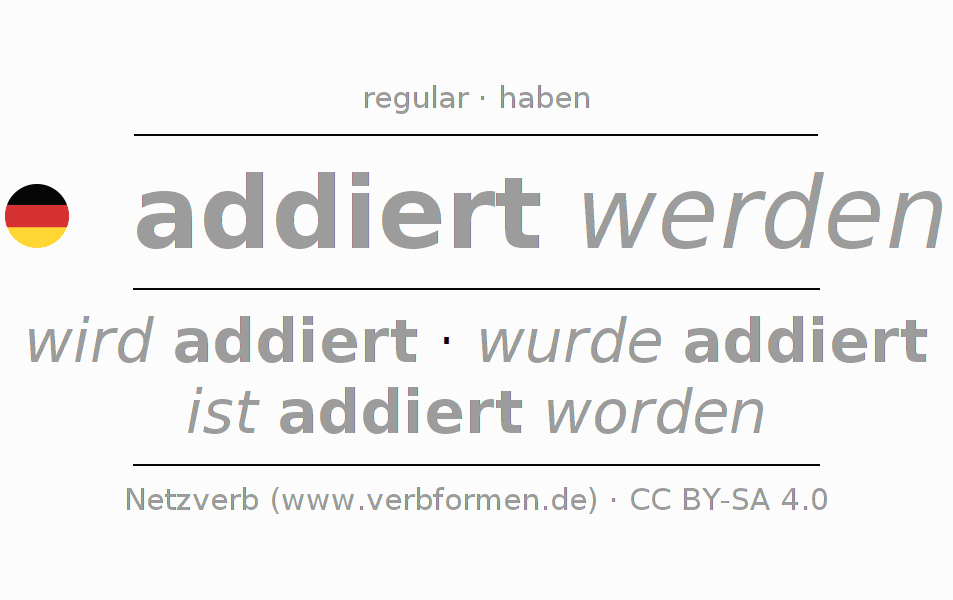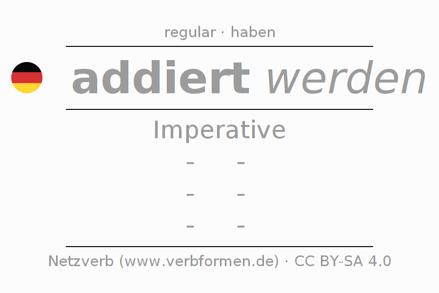 The conjugation of addieren in Imperative Present Imperative Passive is -, -, -, -.The conjugation corresponds to certain grammatical rules. Likewise the requirements for the conjugation of the simple verb forms of addieren in Imperative. Comments ☆