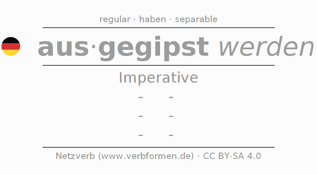 The conjugation of ausgipsen in Imperative Present Imperative Passive is -, -, -, -.The conjugation corresponds to certain grammatical rules. Likewise the requirements for the conjugation of the simple verb forms of ausgipsen in Imperative. Comments ☆