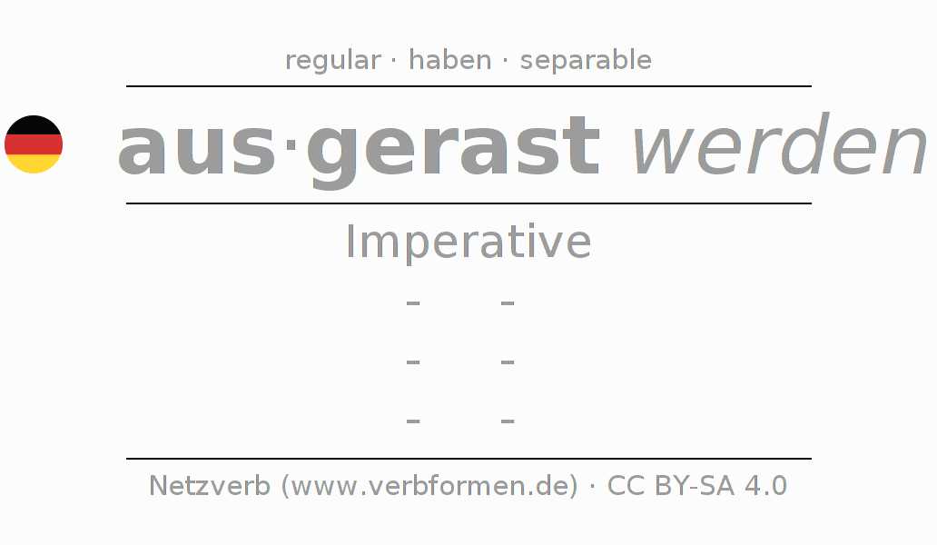 The conjugation of ausrasen in Imperative Present Imperative Passive is -, -, -, -.The conjugation corresponds to certain grammatical rules. Likewise the requirements for the conjugation of the simple verb forms of ausrasen in Imperative. Comments ☆