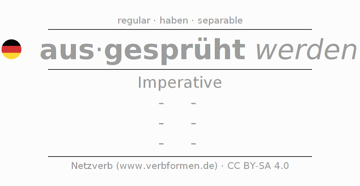The conjugation of aussprühen in Imperative Present Imperative Passive is -, -, -, -.The conjugation corresponds to certain grammatical rules. Likewise the requirements for the conjugation of the simple verb forms of aussprühen in Imperative. Comments ☆