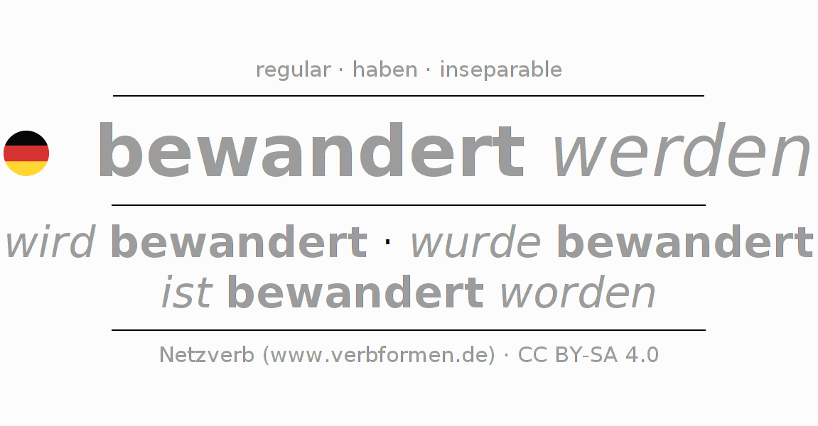 The conjugation of bewandern in Imperative Present Imperative Passive is -, -, -, -.The conjugation corresponds to certain grammatical rules. Likewise the requirements for the conjugation of the simple verb forms of bewandern in Imperative. Comments ☆