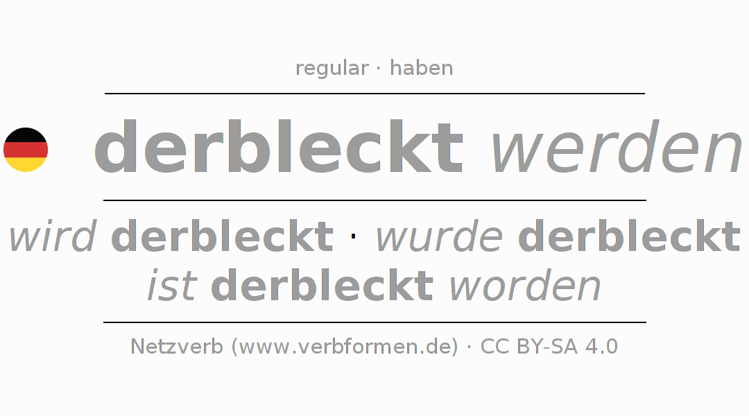 The conjugation of derblecken in Imperative Present Imperative Passive is -, -, -, -.The conjugation corresponds to certain grammatical rules. Likewise the requirements for the conjugation of the simple verb forms of derblecken in Imperative. Comments ☆
