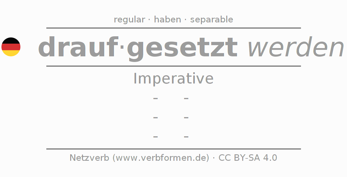 The conjugation of draufsetzen in Imperative Present Imperative Passive is -, -, -, -.The conjugation corresponds to certain grammatical rules. Likewise the requirements for the conjugation of the simple verb forms of draufsetzen in Imperative. Comments ☆