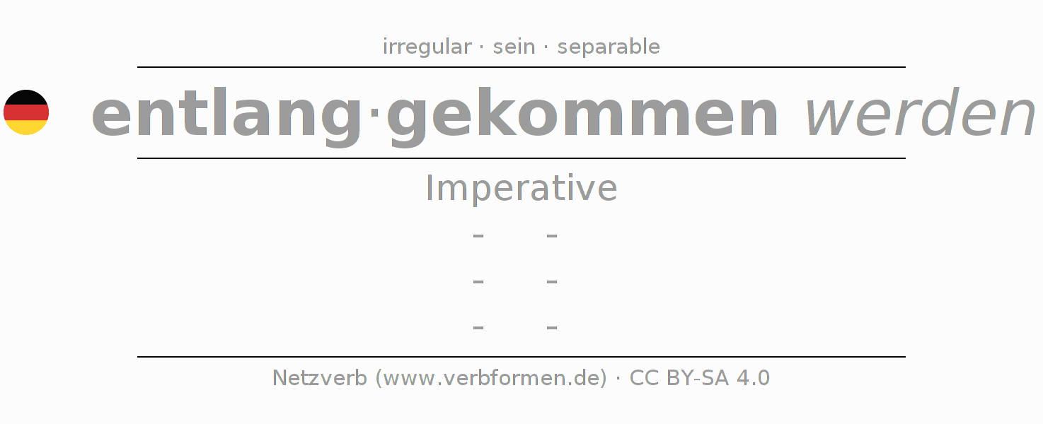 The conjugation of entlangkommen in Imperative Present Imperative Passive is -, -, -, -.The conjugation corresponds to certain grammatical rules. Likewise the requirements for the conjugation of the simple verb forms of entlangkommen in Imperative. Comments ☆