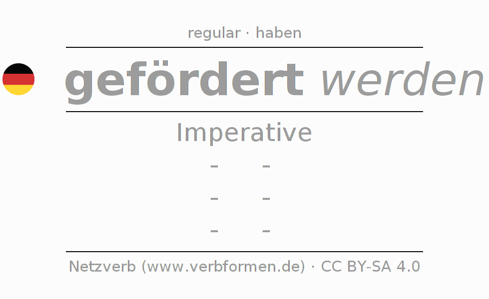 The conjugation of fördern in Imperative Present Imperative Passive is -, -, -, -.The conjugation corresponds to certain grammatical rules. Likewise the requirements for the conjugation of the simple verb forms of fördern in Imperative. Comments ☆
