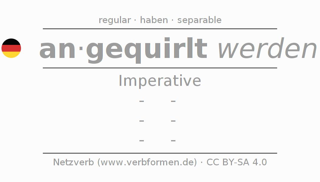 The conjugation of anquirlen in Imperative Present Imperative Passive is -, -, -, -.The conjugation corresponds to certain grammatical rules. Likewise the requirements for the conjugation of the simple verb forms of anquirlen in Imperative. Comments ☆