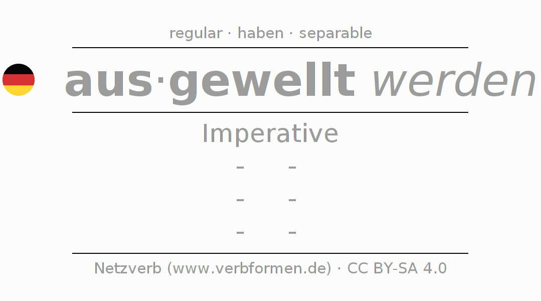 The conjugation of auswellen in Imperative Present Imperative Passive is -, -, -, -.The conjugation corresponds to certain grammatical rules. Likewise the requirements for the conjugation of the simple verb forms of auswellen in Imperative. Comments ☆