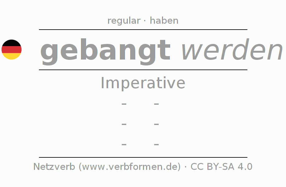 The conjugation of bangen in Imperative Present Imperative Passive is -, -, -, -.The conjugation corresponds to certain grammatical rules. Likewise the requirements for the conjugation of the simple verb forms of bangen in Imperative. Comments ☆