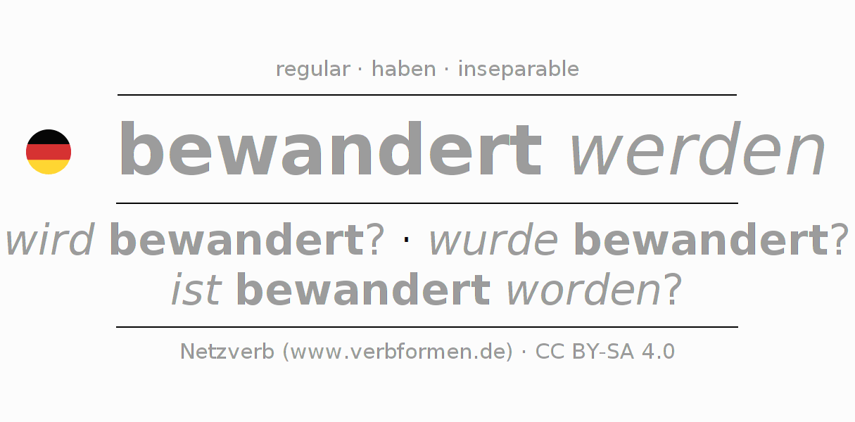 The conjugation of bewandern in Imperative Present Imperative Passive is -, -, -, -.The conjugation corresponds to certain grammatical rules. Likewise the requirements for the conjugation of the simple verb forms of bewandern in Imperative. Comments ☆