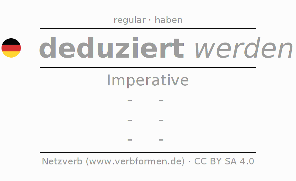 The conjugation of deduzieren in Imperative Present Imperative Passive is -, -, -, -.The conjugation corresponds to certain grammatical rules. Likewise the requirements for the conjugation of the simple verb forms of deduzieren in Imperative. Comments ☆