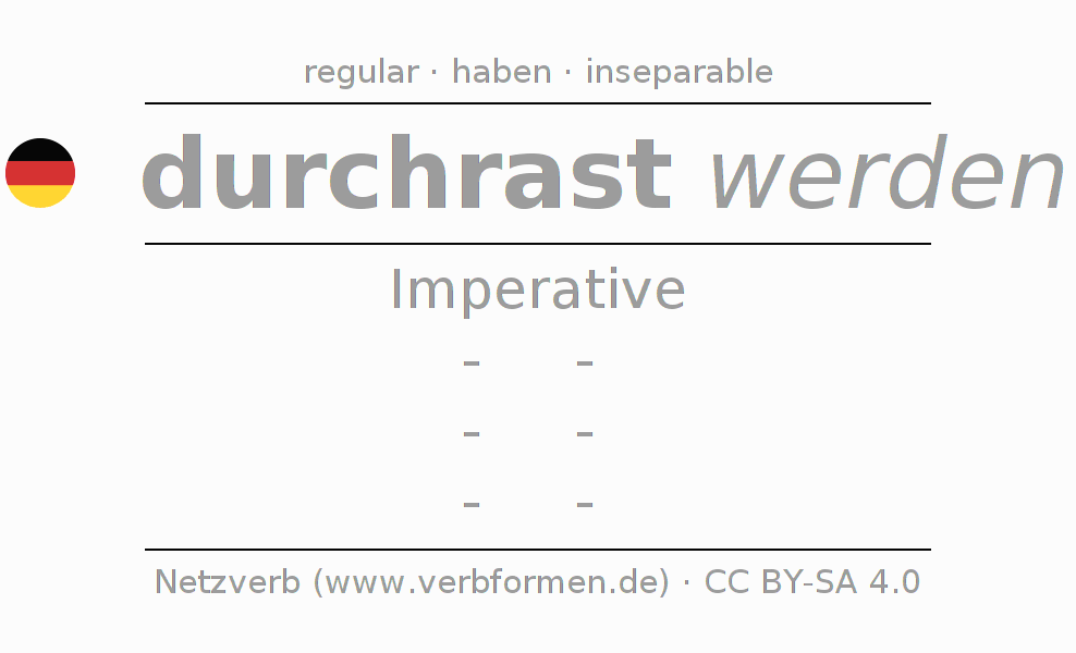 The conjugation of durchrasen in Imperative Present Imperative Passive is -, -, -, -.The conjugation corresponds to certain grammatical rules. Likewise the requirements for the conjugation of the simple verb forms of durchrasen in Imperative. Comments ☆