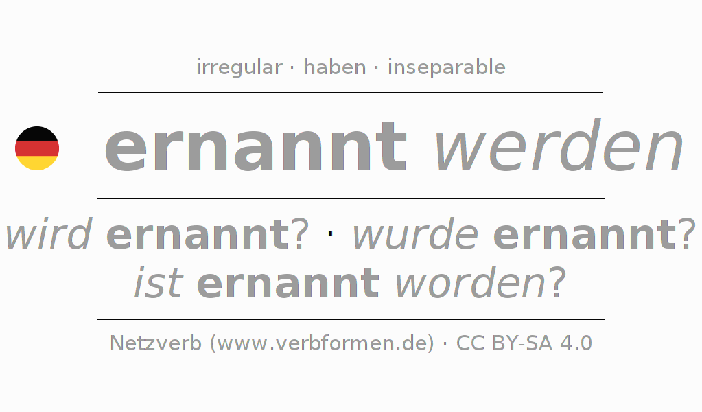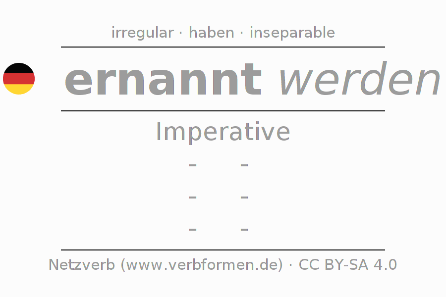 The conjugation of ernennen in Imperative Present Imperative Passive is -, -, -, -.The conjugation corresponds to certain grammatical rules. Likewise the requirements for the conjugation of the simple verb forms of ernennen in Imperative. Comments ☆