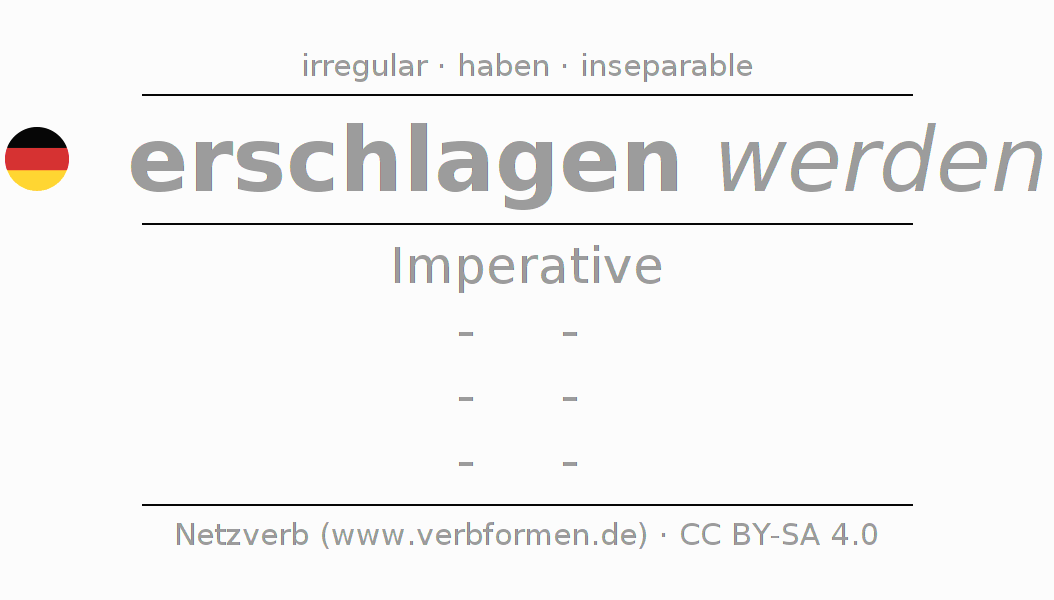 The conjugation of erschlagen in Imperative Present Imperative Passive is -, -, -, -.The conjugation corresponds to certain grammatical rules. Likewise the requirements for the conjugation of the simple verb forms of erschlagen in Imperative. Comments ☆