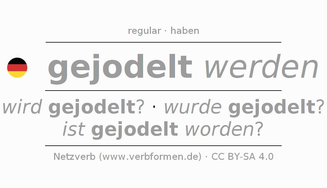 The conjugation of jodeln in Imperative Present Imperative Passive is -, -, -, -.The conjugation corresponds to certain grammatical rules. Likewise the requirements for the conjugation of the simple verb forms of jodeln in Imperative. Comments ☆