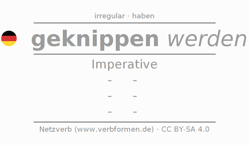The conjugation of kneipen in Imperative Present Imperative Passive is -, -, -, -.The conjugation corresponds to certain grammatical rules. Likewise the requirements for the conjugation of the simple verb forms of kneipen in Imperative. Comments ☆