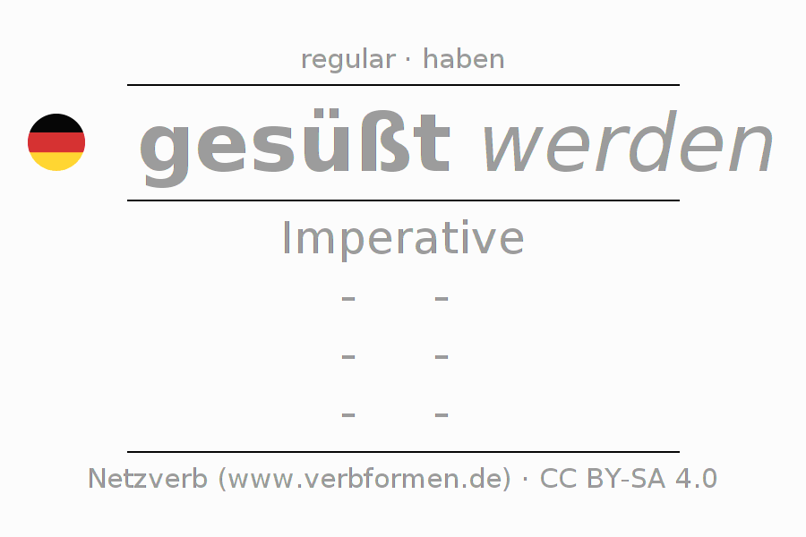 The conjugation of süßen in Imperative Present Imperative Passive is -, -, -, -.The conjugation corresponds to certain grammatical rules. Likewise the requirements for the conjugation of the simple verb forms of süßen in Imperative. Comments ☆