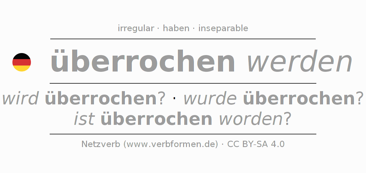 The conjugation of überriechen in Imperative Present Imperative Passive is -, -, -, -.The conjugation corresponds to certain grammatical rules. Likewise the requirements for the conjugation of the simple verb forms of überriechen in Imperative. Comments ☆