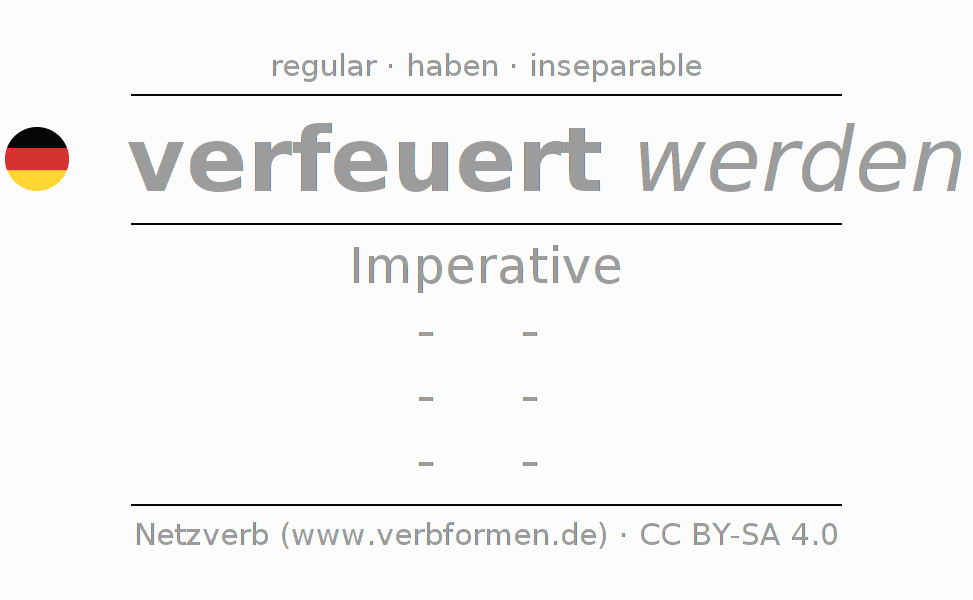 The conjugation of verfeuern in Imperative Present Imperative Passive is -, -, -, -.The conjugation corresponds to certain grammatical rules. Likewise the requirements for the conjugation of the simple verb forms of verfeuern in Imperative. Comments ☆