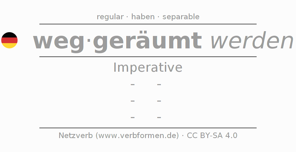 The conjugation of wegräumen in Imperative Present Imperative Passive is -, -, -, -.The conjugation corresponds to certain grammatical rules. Likewise the requirements for the conjugation of the simple verb forms of wegräumen in Imperative. Comments ☆