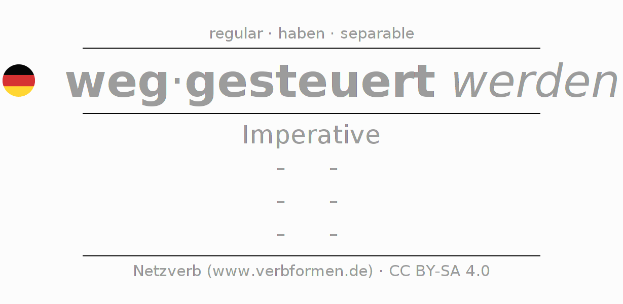 The conjugation of wegsteuern in Imperative Present Imperative Passive is -, -, -, -.The conjugation corresponds to certain grammatical rules. Likewise the requirements for the conjugation of the simple verb forms of wegsteuern in Imperative. Comments ☆