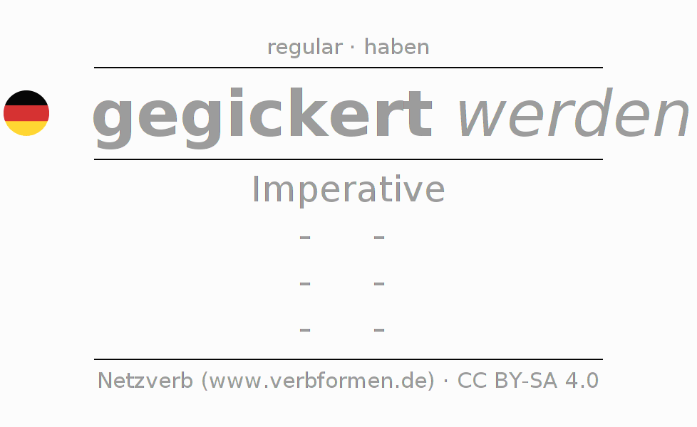 The conjugation of gickern in Imperative Present Imperative Passive is -, -, -, -.The conjugation corresponds to certain grammatical rules. Likewise the requirements for the conjugation of the simple verb forms of gickern in Imperative. Comments ☆