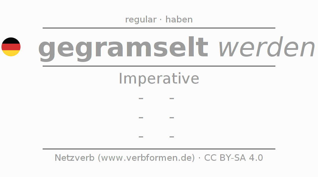 The conjugation of gramseln in Imperative Present Imperative Passive is -, -, -, -.The conjugation corresponds to certain grammatical rules. Likewise the requirements for the conjugation of the simple verb forms of gramseln in Imperative. Comments ☆