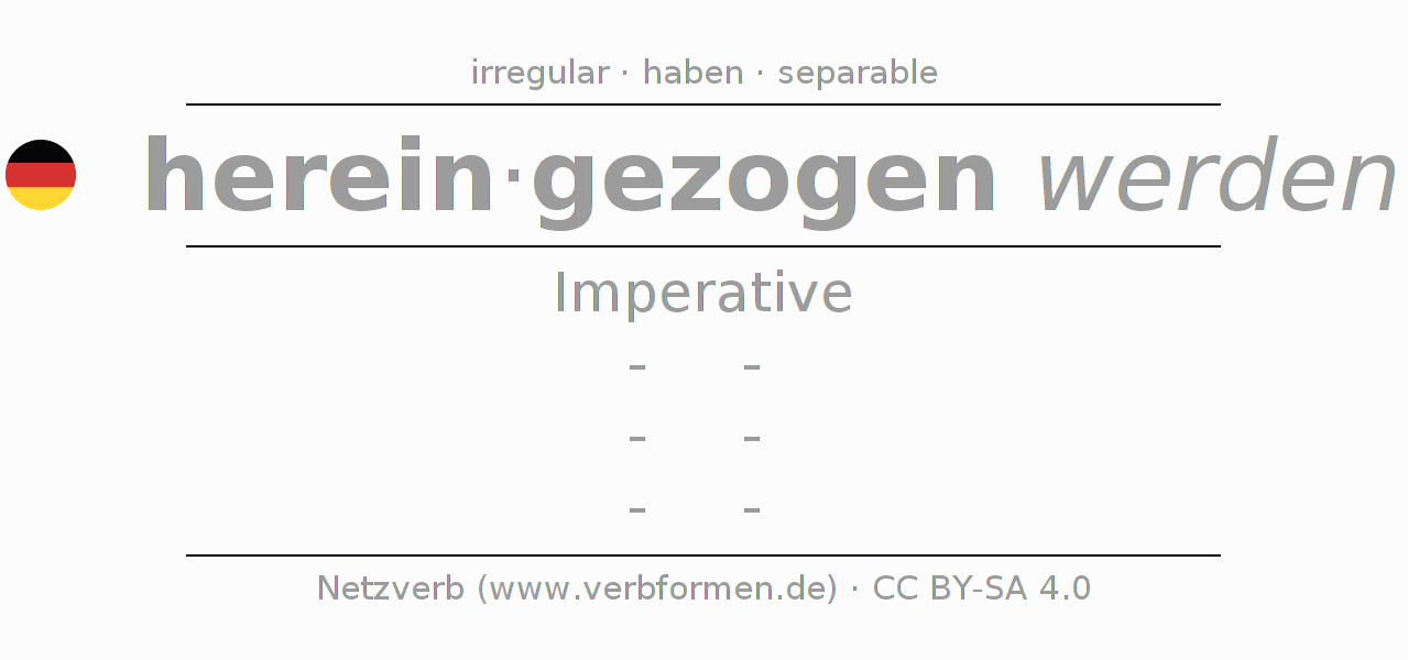 The conjugation of hereinziehen in Imperative Present Imperative Passive is -, -, -, -.The conjugation corresponds to certain grammatical rules. Likewise the requirements for the conjugation of the simple verb forms of hereinziehen in Imperative. Comments ☆