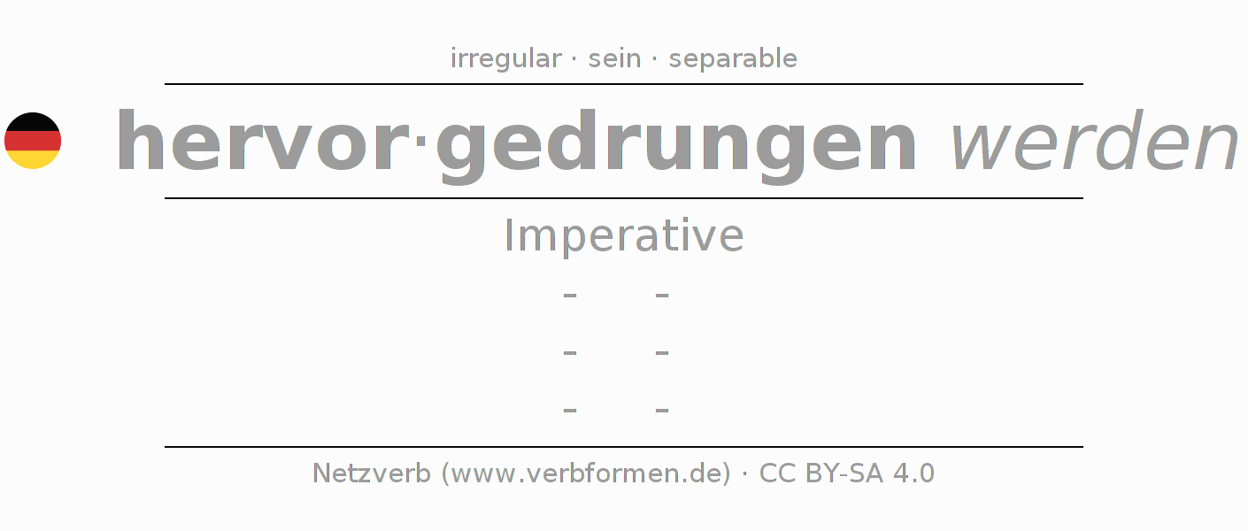 The conjugation of hervordringen in Imperative Present Imperative Passive is -, -, -, -.The conjugation corresponds to certain grammatical rules. Likewise the requirements for the conjugation of the simple verb forms of hervordringen in Imperative. Comments ☆