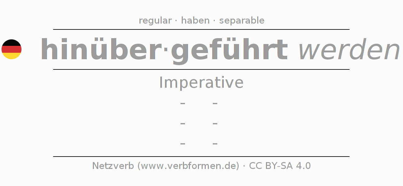 The conjugation of hinüberführen in Imperative Present Imperative Passive is -, -, -, -.The conjugation corresponds to certain grammatical rules. Likewise the requirements for the conjugation of the simple verb forms of hinüberführen in Imperative. Comments ☆