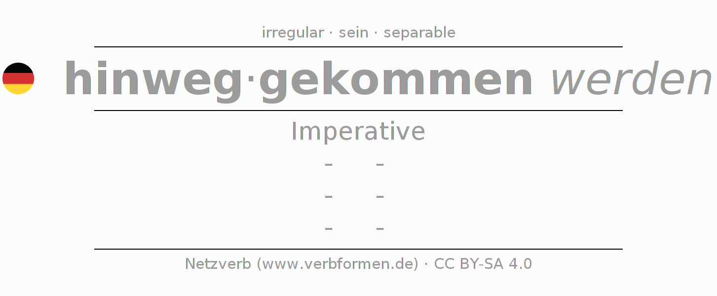 The conjugation of hinwegkommen in Imperative Present Imperative Passive is -, -, -, -.The conjugation corresponds to certain grammatical rules. Likewise the requirements for the conjugation of the simple verb forms of hinwegkommen in Imperative. Comments ☆