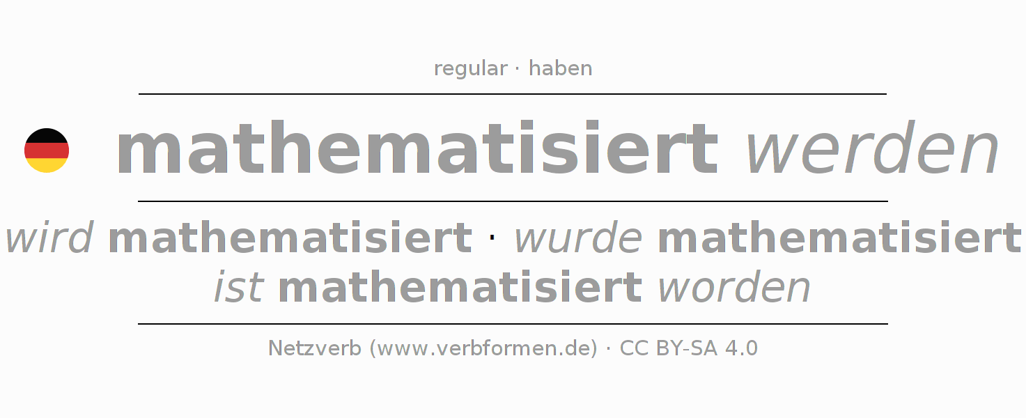 The conjugation of mathematisieren in Imperative Present Imperative Passive is -, -, -, -.The conjugation corresponds to certain grammatical rules. Likewise the requirements for the conjugation of the simple verb forms of mathematisieren in Imperative. Comments ☆