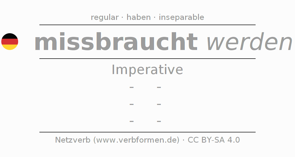 The conjugation of missbrauchen in Imperative Present Imperative Passive is -, -, -, -.The conjugation corresponds to certain grammatical rules. Likewise the requirements for the conjugation of the simple verb forms of missbrauchen in Imperative. Comments ☆
