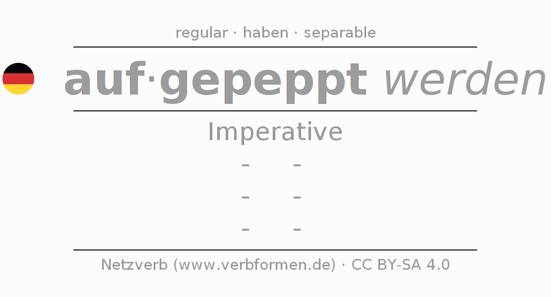 The conjugation of aufpeppen in Imperative Present Imperative Passive is -, -, -, -.The conjugation corresponds to certain grammatical rules. Likewise the requirements for the conjugation of the simple verb forms of aufpeppen in Imperative. Comments ☆