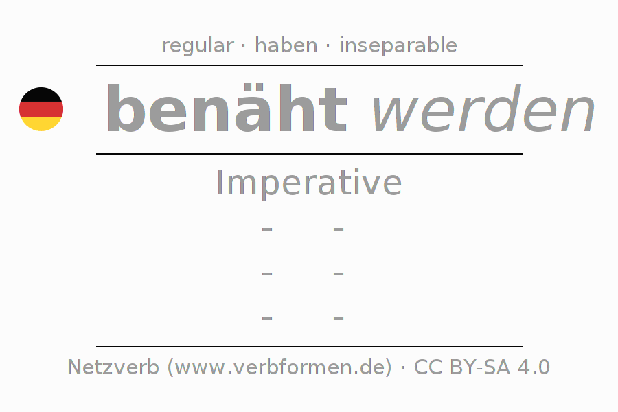 The conjugation of benähen in Imperative Present Imperative Passive is -, -, -, -.The conjugation corresponds to certain grammatical rules. Likewise the requirements for the conjugation of the simple verb forms of benähen in Imperative. Comments ☆