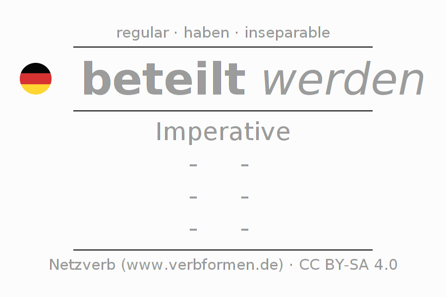 The conjugation of beteilen in Imperative Present Imperative Passive is -, -, -, -.The conjugation corresponds to certain grammatical rules. Likewise the requirements for the conjugation of the simple verb forms of beteilen in Imperative. Comments ☆