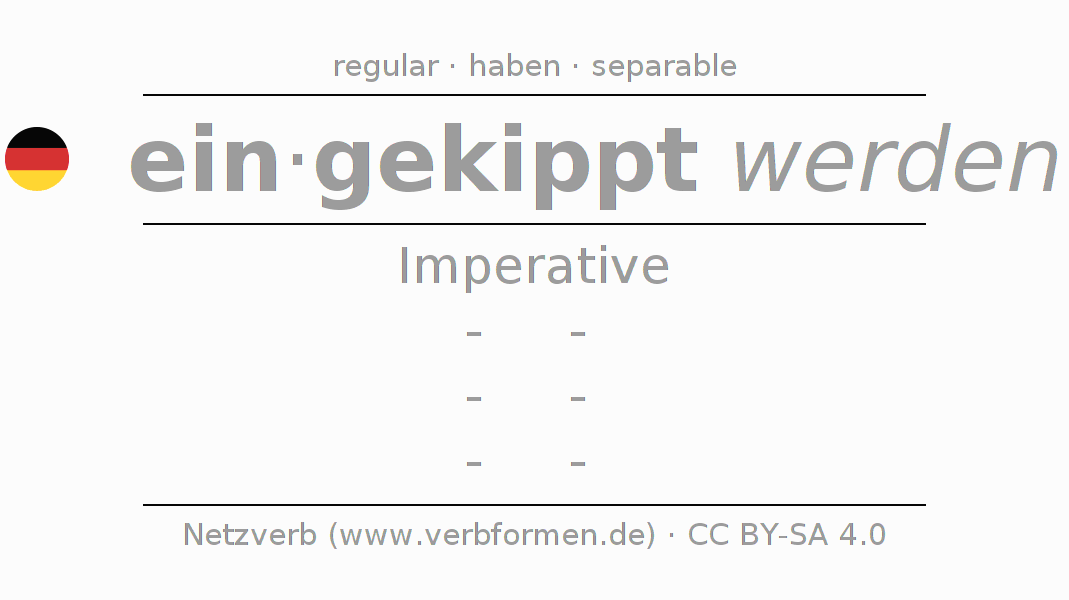 The conjugation of einkippen in Imperative Present Imperative Passive is -, -, -, -.The conjugation corresponds to certain grammatical rules. Likewise the requirements for the conjugation of the simple verb forms of einkippen in Imperative. Comments ☆
