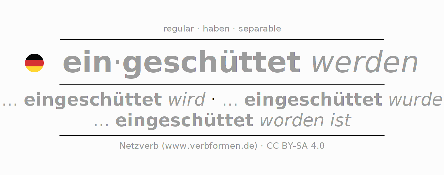 The conjugation of einschütten in Imperative Present Imperative Passive is -, -, -, -.The conjugation corresponds to certain grammatical rules. Likewise the requirements for the conjugation of the simple verb forms of einschütten in Imperative. Comments ☆