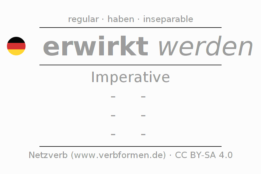 The conjugation of erwirken in Imperative Present Imperative Passive is -, -, -, -.The conjugation corresponds to certain grammatical rules. Likewise the requirements for the conjugation of the simple verb forms of erwirken in Imperative. Comments ☆