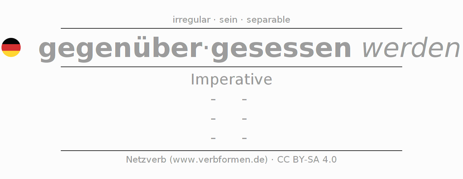 The conjugation of gegenübersitzen in Imperative Present Imperative Passive is -, -, -, -.The conjugation corresponds to certain grammatical rules. Likewise the requirements for the conjugation of the simple verb forms of gegenübersitzen in Imperative. Comments ☆