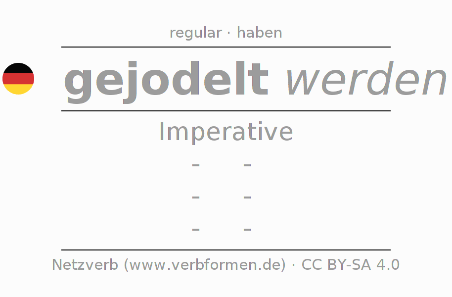 The conjugation of jodeln in Imperative Present Imperative Passive is -, -, -, -.The conjugation corresponds to certain grammatical rules. Likewise the requirements for the conjugation of the simple verb forms of jodeln in Imperative. Comments ☆